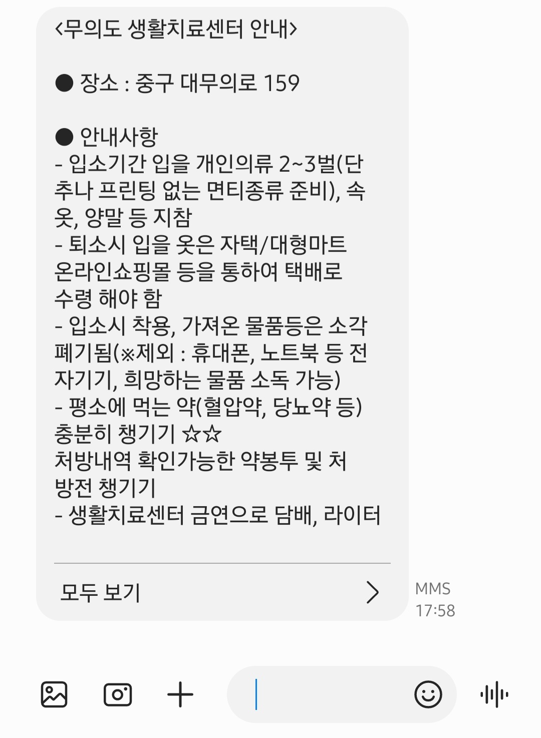 전화로 기숙사 살아서 재택치료가 불가능하다고 하니 바로 이렇게 문자가 옵니다.