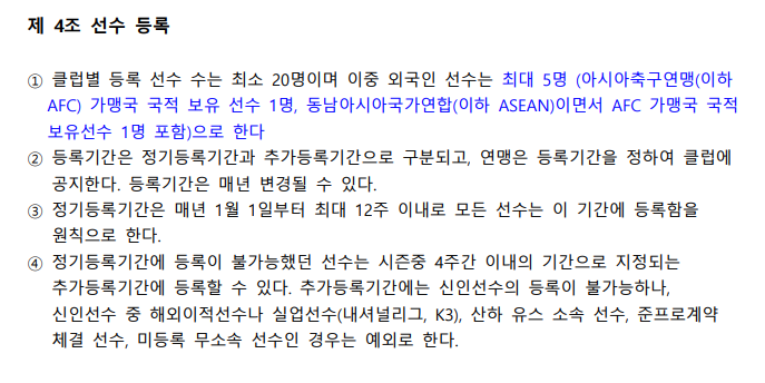 k리그 정관 4조 선수 등록에 따르면